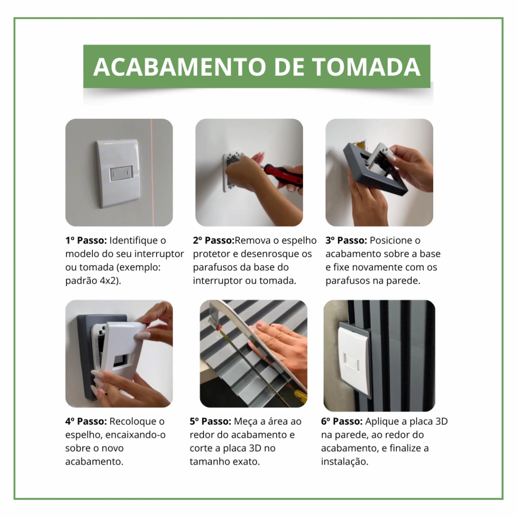 O acabamento 3D para tomadas e interruptores é ideal para um ótimo acabamento no revestimento Premium 3D. Disponível em diferentes cores, você pode deixar o seu ambiente mais bonito nos minímos detalhes!