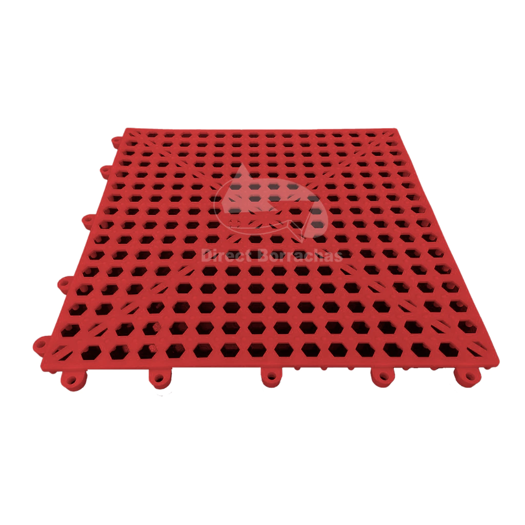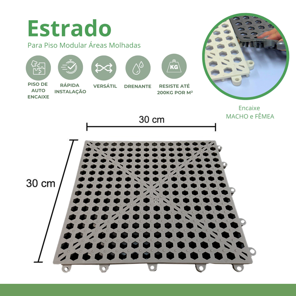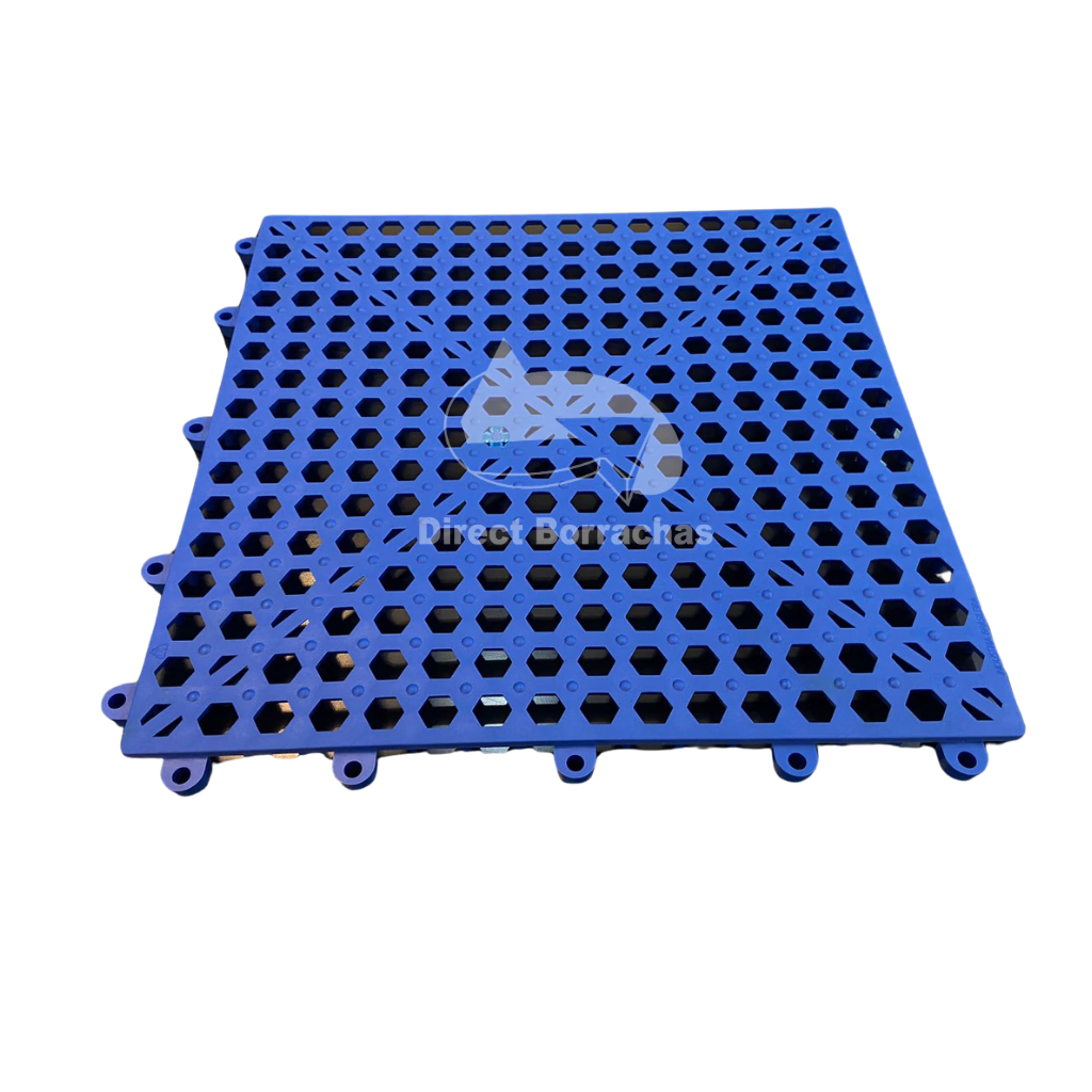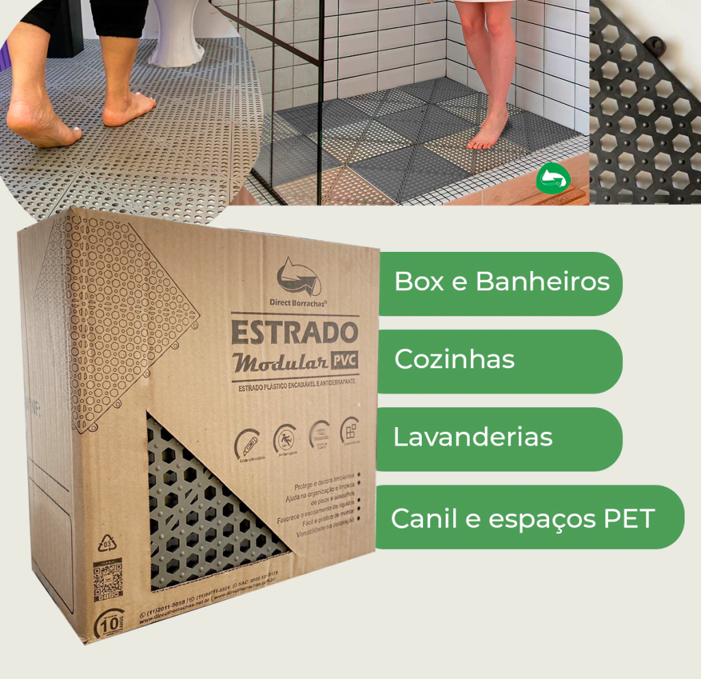 O Estrado Antiderrapante Modular de Plástico PVC é piso de segurança para áreas úmidas e molhadas. O material e formato empregados em sua constituição o tornam ideal como piso isolante leve, resistente, modular, removível, higiênico e confortável.